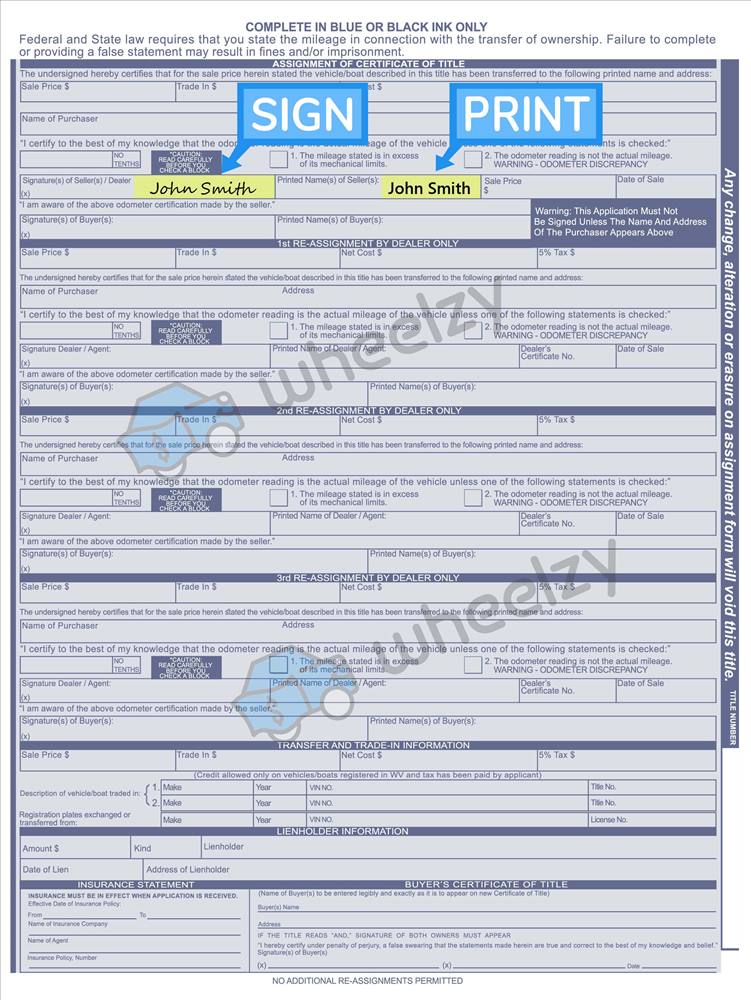 - Back of the title right next to where you signed name(s) - print name(s) on the line where it reads "Printed Name(s) of Seller(s)."